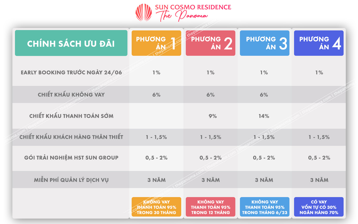 Tại phân khu căn hộ cao cấp The Panoma tập đoàn Sun Group mang tới cho khách hàng của mình 04 phương án thanh toán khác nhau bao gồm: Thanh toán cơ bản, Thanh toán nhanh, Thanh toán sớm và Thanh toán vay vốn trong đó với mỗi phương án khách hàng sẽ được nhận những chính sách ưu đãi chiết khấu phù hợp: